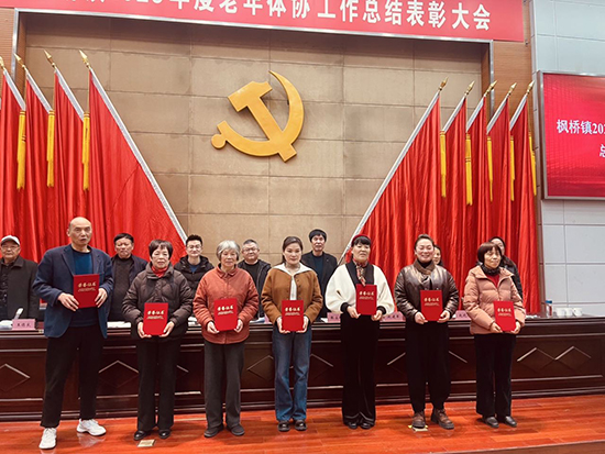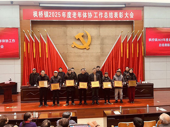 会上,枫桥镇老年体协副主席王汤渭宣读了枫老协[2026]1号表彰文件。霞朗桥村等13个村(社团)获评镇老年体协年度先进集体,杨仲木、陈培良等19位同志获评年度先进个人。值得一提的是,枫桥镇老年体协凭借突出表现,再次荣获诸暨市年度老年体育工作特等奖,并斩获“浙江省老年体育工作先进单位”荣誉。受表彰代表分五批依次上台,在热烈的掌声中从与会领导手中接过奖牌,脸上洋溢着自豪与喜悦。