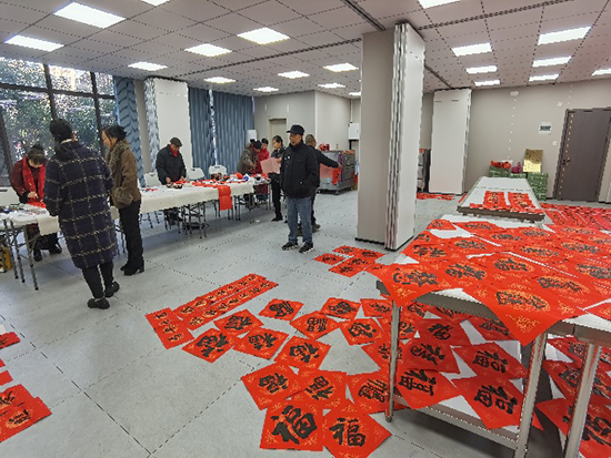 活动现场,几张铺着大红宣纸的书桌前围满了闻讯而来的市民。受邀老师们凝神聚气,提笔、运腕、落墨一气呵成,隶书的古朴厚重、楷书的端庄工整、行书的飘逸灵动在红纸上一一呈现。“福满人间诸事顺,春回大地万象新”“吉气盈门招百福,祥光入户纳千祥”等一副副寓意吉祥的春联,以及一个个饱满喜庆的“福”字,带着墨汁的清香新鲜“出炉”,瞬间点燃了现场的新春氛围。