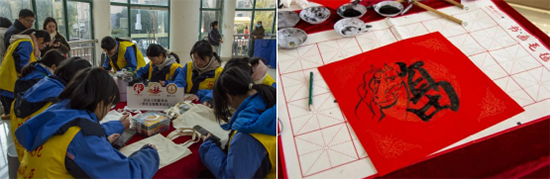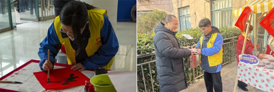 活动现场氛围温馨有序。工美专业学生现场挥毫,书写并赠送“福”字与春联近百份,引来居民连连称赞。同时,志愿者们将提前熬制的腊八粥分装好,逐一递到社区老人手中。一碗碗热粥,不仅暖身更暖心,承载着学生们对社区居民的真诚关怀。