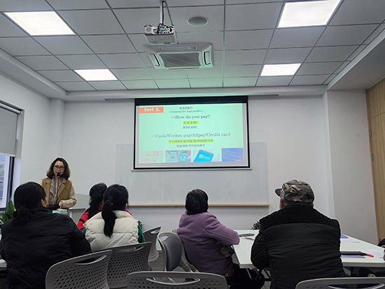 课程伊始,葛秀华副教授以“英语数字”为切入点,通过快速问答、情景对话等方式带领学员回顾上节课内容,帮助大家巩固英文数词的发音与用法。“从‘one’到‘one hundred’,这些数字在日常交易、游客接待中太实用了!”余村商户王大姐边记笔记边感慨。