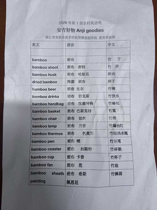 本次新课紧扣“共富”主题,聚焦“安吉好物”的英语表达。葛教授结合安吉白茶、竹制品、笋干等地方特色产品,通过“单词卡+实物展示”的方式,逐一教学“Anji White Tea”“bamboo products”“dried bamboo shoots”等核心词汇,并创新采用“中文读音标注”辅助记忆,降低学习门槛。针对村民关心的“好物购”场景,她重点讲解了“How much is it?”“How do you pay?”等实用句型,现场模拟买卖对话,让学员在互动中掌握沟通技巧。