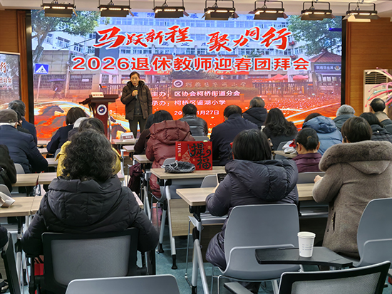 1月27日上午,绍兴市柯桥区柯桥成人文化技术学校联合柯桥区退休教师协会柯桥街道分会,在鉴湖小学报告厅举行“2026退休教师团拜暨第十五个五年规划报告会”。柯桥街道教育党委书记金明东,柯桥区退教协会会长高渭民、副会长孙华劬、鉴湖小学校长范信子及柯桥街道退休教师95人参加。
