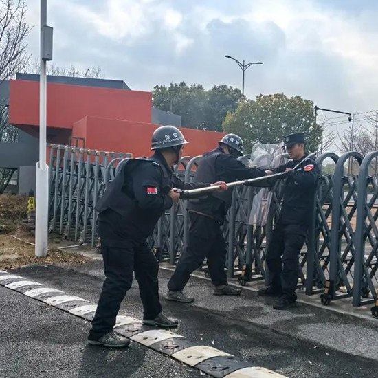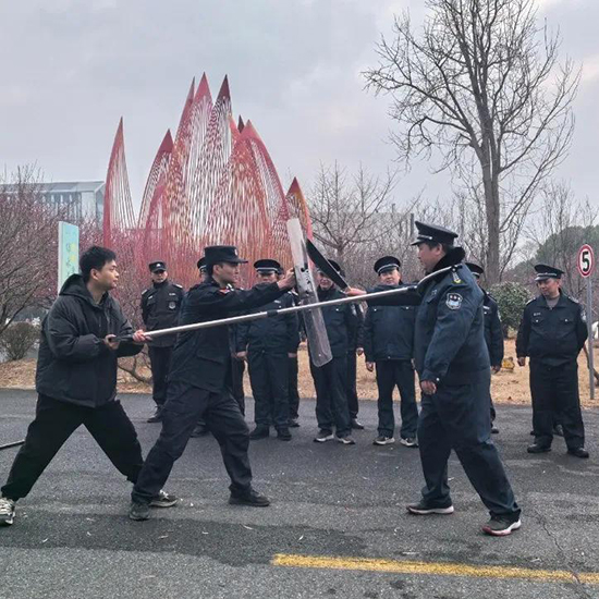 演练由两校安保服务承包单位相关负责人进行现场指挥,重点围绕防暴器械规范使用、战术小组协同配合、突发事件应急处置等环节展开。在专业讲解与示范后,参演安保人员模拟了“校门遭遇歹徒强行闯入”的突发情景,按照预案迅速启动应急机制,运用钢叉、盾牌、防暴棍等器械展开协同处置,有效控制了事态发展。