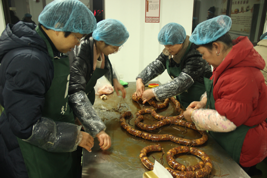 培训现场,该校邀请了绍兴市非物质文化遗产安昌腊肠制作技术代表性传承人,绍兴安昌哈哈香肠食品厂老厂长成永才从选料、配料、灌肠、晾晒等环节进行了系统讲解和示范。居民们认真聆听,不时提问互动,现场气氛热烈。在实践环节,大家分组动手操作,从猪肉的肥瘦搭配、调味料的精准配比,到灌肠技巧的掌握,每个步骤都学得格外认真。不少居民表示,这是第一次亲手制作香肠,既新鲜又有成就感。