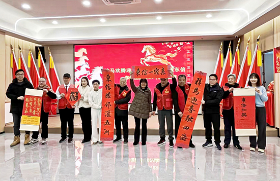 第二篇章“绽·乐龄风采”生动诠释了银龄群体的蓬勃朝气。韩金芳等带来的非洲鼓《美丽中国》率先登场,激昂鼓点与明快旋律交织,表达了对祖国山河的深情礼赞。随后,东信社区党委书记、居委会主任戴笔峰登台致辞,向全体居民致以诚挚的新春祝福,并展望社区未来发展愿景。社区书画达人现场创作并赠送书画作品,由社区班子成员代表接收,笔墨丹青间流淌着深厚的文化底蕴与邻里情谊。展演环节精彩不断:太极队表演的《太乙游龙拳》刚柔相济,尽显东方哲学之美;浪浪姐妹团的舞蹈串烧活力绽放,瞬间点燃全场热情;民乐团演奏的《赛马》紧扣马年主题,将现场氛围推向高潮。此外,男声小合唱《少林少林》、健身秧歌舞《又唱浏阳河》、深情朗诵《我们的社区 我们的家》等节目轮番上演,充分展现了社区居民的多才多艺与对家园的深切热爱。