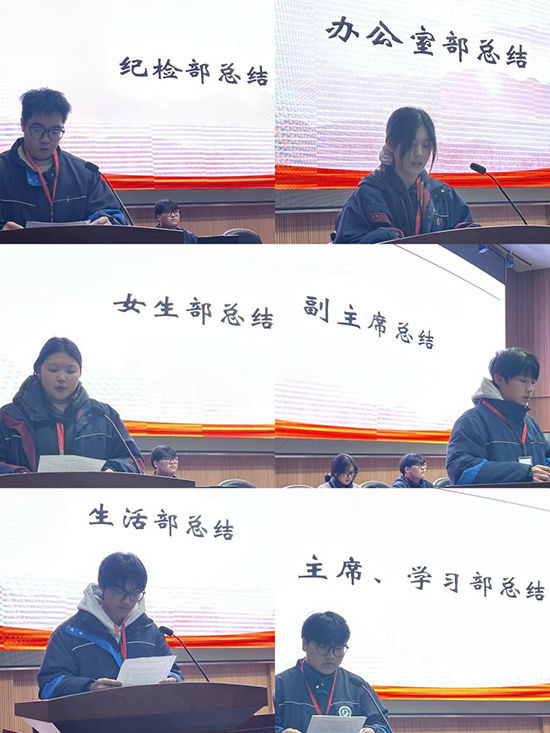 在总结交流环节,学生会各主要负责人依次发言,围绕年度工作亮点与不足进行复盘:既谈活动组织与服务同学的收获,也坦诚交流部门协作、信息反馈、执行细节等方面仍需提升之处,并提出下一步改进方向与工作设想。这一过程也把问题识别、过程改进与共同提升融入日常运行,体现了“三全育人”背景下学生自治平台在全过程引导、全员协同参与、全方位服务成长中的育人功能。