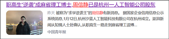曾被《人民日报》点赞的“逆袭王”、温州市龙湾区职业技术学校毕业生周信静,近期再传重磅消息——周信静作为股东的杭州汐蓝人工智能科技有限公司正式成立,这位从职高走出的MIT博士,如今躬身入局人工智能创业赛道。