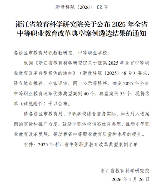近日,浙江省教育科学研究院正式公布2025年浙江省中等职业教育改革典型案例获奖名单,云和县中等职业技术学校凭借两项极具创新性与实践价值的改革成果强势入选,其中《从“依附”到“共生”:县域职业学校“反哺式”产教融合创新实践》与《构建“多维赋能、共生共长”的产教融合新范式——以木制玩具制作国家开放型产教融合实践中心建设为例》均获评省级优秀典型案例,彰显了学校在职业教育改革领域的深厚积淀与先锋实力。截至目前,学校已累计荣获省级职业教育改革典型案例和优秀典型案例6项、市级职业教育改革典型案例14项。