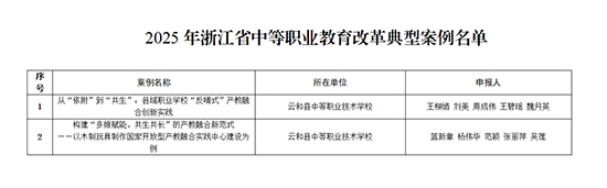 两项案例的成功入选,是对云和职技校深耕职业教育改革、深化产教融合创新的高度认可。未来,学校将继续秉持创新精神,持续完善“反哺式”融合与开放型实践中心建设模式,为县域职业教育与区域产业协同发展提供更多可复制、可推广的“云和模式”,助力职业教育高质量发展再谱新篇!(刘婷婷)