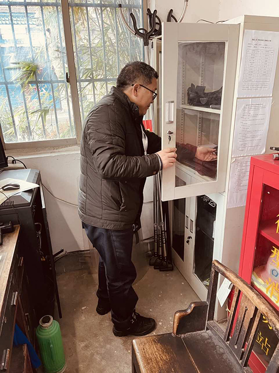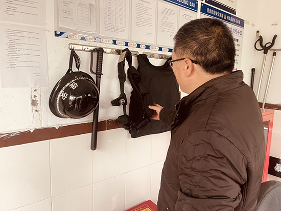 督查首站来到枫桥镇梅苑小学警务室,孙文明重点检查了消防器械、安保设备的保管与配备情况,现场查看发现,该校防卫器械标注清晰、摆放有序、整洁完好,数量完全匹配值守人员需求。现场测试中,保安人员能熟练操作一键报警器,精准完成监控视频回放查看,校园视频监控保存时长达标90天;警务室内6本安全管理记录本填写完整、内容详实,且未发现违规使用取暖设备现象。在校门区域,督查组核查了减速带、警示标志的设置情况,确认硬质防冲撞设施配备到位,家长等候区规划合理。随后,督查组实地踏看校园围墙内侧、篮球架、闲置宿舍楼、原食堂餐厅及车棚等重点区域,所有闲置房屋均实现规范上锁管理,无安全隐患。