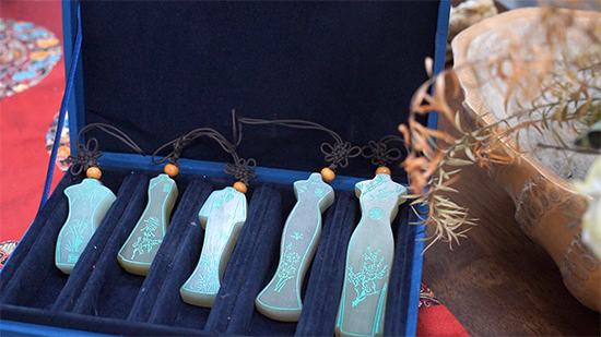 无数次深夜研讨、反复打磨设计方案,张西琴的时尚视野与董利民的非遗功底形成完美互补。他们摒弃简单的元素叠加,转而追求文化精神的深度契合,最终确定以“五韵·五和”为核心主题,将梅、兰、竹、菊、荷五种花木雅韵与采荷“和乐、和善、和美、和睦、和顺”的“五和”理念一一对应,通过金石篆刻的艺术形式呈现在旗袍之上,让每一件作品都成为可穿戴的文化载体。
