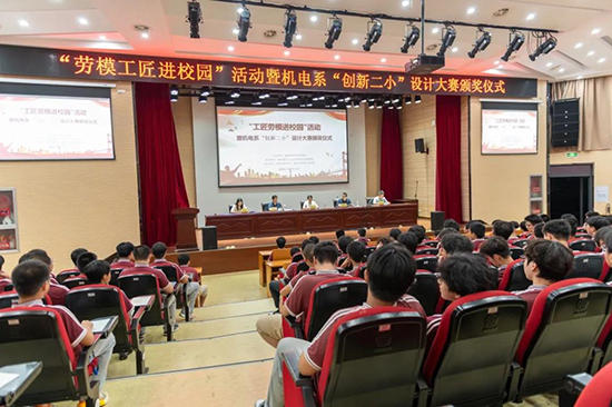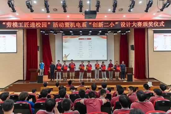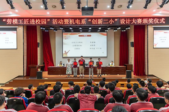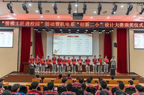 2025年10月13日晚,新昌技师学院机电系在七星校区报告厅成功举办“劳模工匠进校园”活动暨“创新二小”设计大赛颁奖仪式。