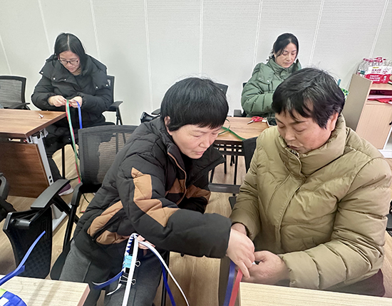 在老师的手把手教学下,大家全神贯注、动手实践,穿、绕、压、编,一根根普通绳线在指尖灵动穿梭,慢慢勾勒出编织包手柄的轮廓,来自嘉怡花园的微网格长姜蒙华一边专注操作,一边分享感受,“编织包手柄的过程看起来简单,但是制作起来也很复杂,既要手稳,又要心细,特别考验耐心。”现场氛围轻松融洽,大家相互交流技巧、互帮互助,欢声笑语不断,指尖流转的不仅是绳线,更是邻里温情与节日喜悦。