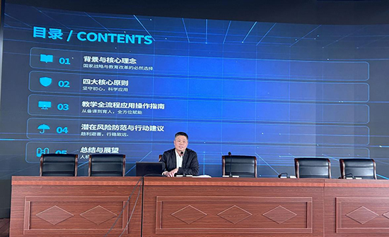 他强调,AI教育已从兴趣课升级为面向全体学生的通识教育,师生要具备AI认知、使用、伦理、创新四大核心素养,坚守育人初心、应用为要、人机协同、技术适配四大原则。校长从备课、课堂、课后辅导、育人管理全流程,指导教师规范、安全、高效运用AI工具,并就数据安全、过度依赖、版权审核等风险作出强调。他号召全体教师积极参与培训、从痛点场景试点、形成人机协同备课模式,将AI应用纳入校本研修,善用国家智慧教育平台资源。他指出,教育的未来是人机协同的智慧育人,全体教师要以技术赋能教学,在变革中实现专业成长,成就每一位学生。