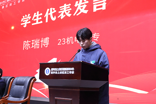 学生代表陈瑞博(23级机电大专)分享了从入学迷茫到斩获省赛一等奖的成长历程。他感言:备赛时泡在工作室里反复练习,放弃了周末与假期,在不断地磨炼中学会了坚持,所有耀眼的荣光背后,不仅是日复一日的坚持,更是对老师们一路陪伴、指导、帮助、鼓励的感恩。