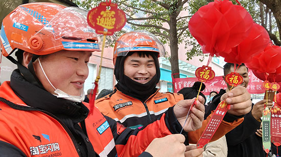 活动现场,五彩斑斓的灯谜条挂满长廊,涵盖民俗知识、安全常识、节气文化等多个类别,兼具趣味性与知识性。刚送完单的骑手们卸下头盔,或独自凝神思索,或三五结伴探讨,不时传出阵阵欢笑声。“这个灯谜我知道答案!”一位小哥揭下灯谜牌,答对后喜滋滋地领取了精美小礼品,现场氛围十分热烈。