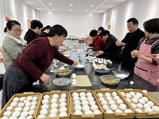 示范结束后,妇女代表们纷纷动手实践,开启了自己的汤圆制作之旅。大家围坐在一起,分工协作、互相交流,有的揉面团、有的搓馅料、有的包汤圆,动作娴熟又认真。虽然部分代表起初手法略显生疏,但在身边伙伴的帮助和工作人员的指导下,很快就掌握了技巧,一个个洁白圆润的汤圆在大家的巧手中慢慢成型,有的圆润饱满,有的小巧玲珑,每一个都承载着大家的心意与祝福。