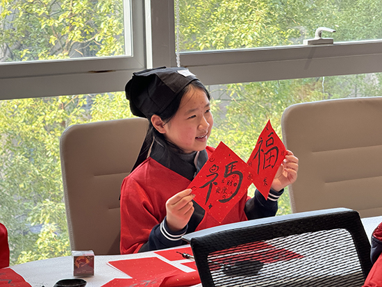 了解了厚重的中医药文化,活动进入了轻松而充满创造性的“笔墨迎春”环节。长桌铺展,红纸笔墨备齐,青少年们执笔挥毫,将刚在汲取的文化灵感注入对联与“福”字的创作中。不再是千篇一律的吉祥话,一副副别出心裁的春联跃然纸上:有的巧妙嵌入中药名称,寓意深远;有的将健康祝愿化为雅词对仗,别具一格。一个个“福”字更是创意无限,有的笔画间仿佛勾勒出草药形态,有的整体设计蕴含平衡和谐的养生理念。活动现场温情满满。家长们不再是旁观者,而是与孩子一起讨论对联内容,帮忙压纸研墨;大学生志愿者们则穿梭其间,指导握笔姿势,讲解平仄韵律。一位父亲拿着孩子写的“药香除旧岁,银针迎新春”对联,拍照分享到朋友圈:“这是孩子最特别的新年礼物。”
