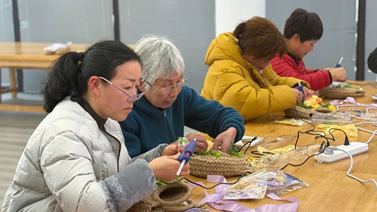 活动中,工作人员采用“讲解+演示”的方式,细致讲解编织包花艺装饰的技巧与要点。居民们认真聆听、热情参与,在工作人员耐心指导下,从生疏到熟练,充分发挥创意,精心搭配花色。现场氛围融洽温馨,大家互相交流、互帮互助,邻里情谊在欢声笑语中不断升温。不一会儿,一件件精致美观的编织作品相继完成,大家手持成品合影留念,脸上洋溢着幸福的笑容。