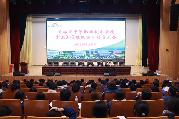 3月11日上午,玉环市中等职业技术学校在大报告厅举行23级3+2班级学生实习动员大会。会议由项目规划处负责人刘振兴主持,教学分管校长颜申君,教务处、项目规划处相关人员,23级实习班级班主任以及全体实习学生参加。动员会旨在为即将踏上实习征程的同学们加油鼓劲,明确实习方向与要求,确保实习工作顺利开展。