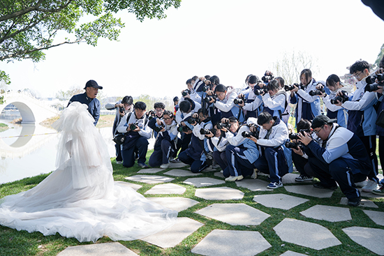 在“都市棱镜·山水间”主题下,他们以简洁的建筑线条为背景,捕捉职业装与园林景观的现代对话;在“瓯蕴·风雅颂”主题中,他们寻找最佳角度,让旗袍与新中式造型在飞檐翘角下绽放东方韵味;在“时空回响·摩登时代”主题里,他们巧用复古洋楼的光影,定格摩登与山水的时空邂逅;在“缘起·山水清音”主题中,他们以纯净构图,记录婚纱于碧水边轻扬的至简至纯。