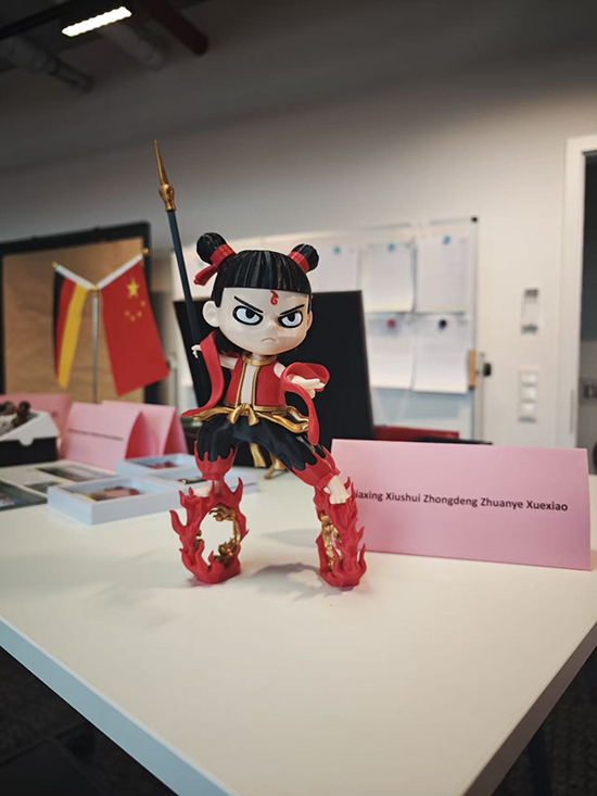 展区一角,一尊栩栩如生的哪吒形象引得嘉宾驻足,这是秀水学子借助3D打印技术完成的艺术实践。从三维建模的反复推敲,到悬空打印时的参数调试;从成型后的手工修补,到后期上色的层层打磨,学生们如哪吒重塑莲身般攻克重重难关,最终让脚踏风火轮、身绕混天绫的少年英雄以极具现代感的姿态走向世界。作品不仅精准捕捉了传统形象的英姿风采,更彰显出秀水学子“敢闯敢创、不畏艰难”的实践精神,也让德国同行感受到中国职业教育在数字制造领域的扎实功底。