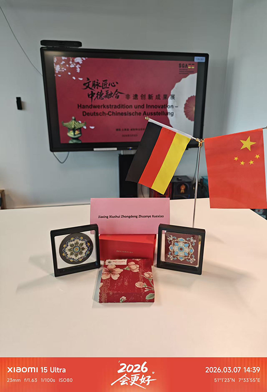 2026年3月9日,在中德职业教育产教融合联盟德方理事会议上,嘉兴市秀水中等专业学校的学生作品精彩亮相,以文化信使之姿,在莱茵兰创新港内,无声讲述中国职教学子的匠心故事。