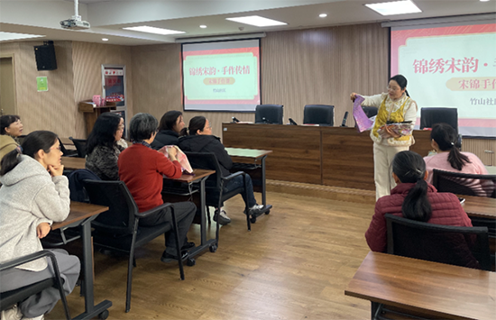 课堂之上,老师一边讲解宋锦的历史渊源与工艺特点,一边引导居民触摸宋锦的经纬纹路,大家直观感受着传统纺织工艺的精湛与厚重,沉浸式体会非遗文化的独特魅力。