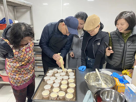 烘焙班暖意融融、香气四溢,老师手把手悉心教学,从蛋白打发到蛋黄糊调制,全程耐心细致指导。学员们动手实操、用心制作,指尖揉出蓬松绵软的面糊,烤箱内香气徐徐升腾,松软香甜的戚风蛋糕新鲜出炉,大家在亲手烘焙中收获乐趣、温暖与成感。