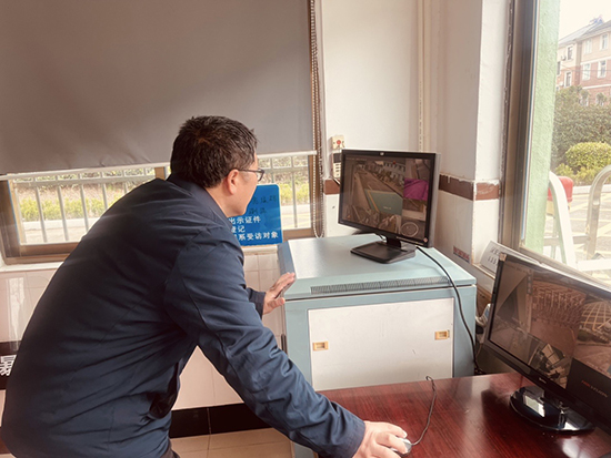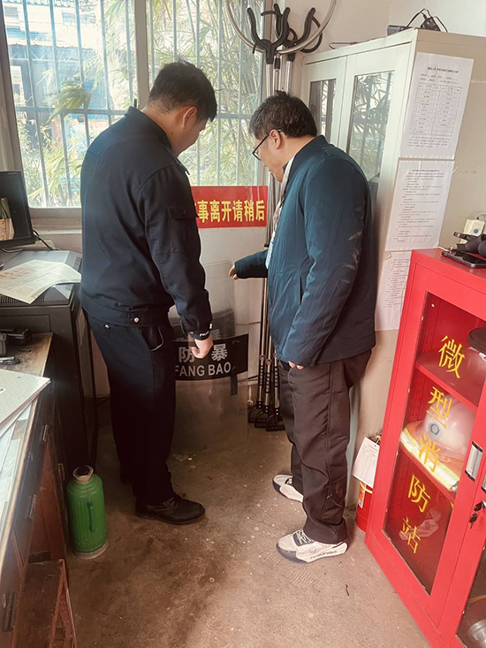 督查首站来到枫桥镇梅苑小学警务室。孙文明重点检查消防器械、安保设备的保管与配备情况。经现场查看,该校防卫器械标注清晰、摆放有序、整洁完好,数量与值守人员需求匹配,无临期、过期现象。督查组现场对保安人员进行监控设备操作测试,保安人员能熟练使用一键报警器,精准回放查看监控视频;警务室内6本安全管理记录本填写规范、内容详实。