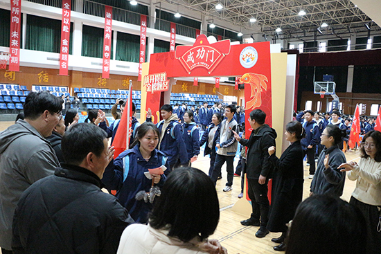 大会尾声,各班在班主任带领下列队退场,学子们挥舞班旗、高喊口号,依次穿过“金榜题名门”。校领导与老师们分列门两侧,与学子们击掌鼓劲,传递温暖与力量。仪式结束后,各班合影留念,学子们纷纷在励志墙前驻足拍照,定格下这充满力量的青春瞬间,为高考冲刺之路注入满满动力。