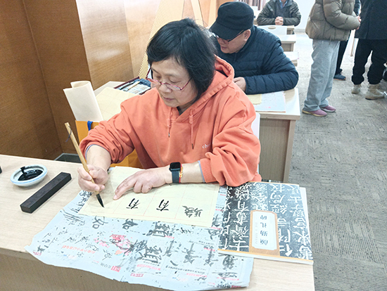同期开班的书法班墨韵飘香、氛围浓厚。本次课程以楷书为核心,选取唐代书法家颜真卿经典名作《颜勤礼碑》为学习范本,字体端庄大气、适合入门研习。社区特邀资深书法教师葛华老师授课,葛老师拥有多年老年书法教学经验,教学方式通俗易懂、因材施教。开班第一课,葛老师先全面了解学员书法基础,开展分层教学;再现场示范运笔、发力、结构布局等关键技巧,细致点评学员作品,帮助大家快速掌握书写要领。零基础学员逐步入门,有基础的学员技艺得到提升,大家静心提笔、认真临摹,在笔墨挥洒间感受中华优秀传统文化魅力。