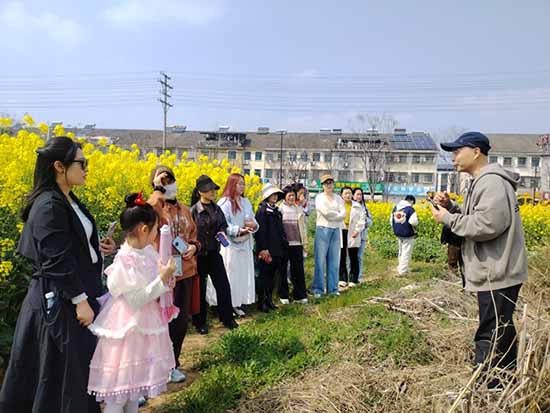 培训现场,秦盱丰老师以田间盛开的油菜花为实景课堂,从构图技巧、光线运用、人物抓拍等方面进行细致讲解与示范。他结合手机摄影的便携性特点,耐心指导学员如何利用身边场景打造富有氛围感的画面,从取景框的选择到快门时机的把握,一步步拆解实操要点。