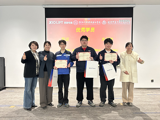 仪式现场进行了培训成果的展示,以及培训优秀学员的表彰。陆乐作为学生代表在仪式上发言,表达接受“中高企一体化”育人的感受:“在学校的学习中,我们更多接触的是理论知识、基础原理,是对专业的初步认知和框架搭建,而来到西奥公司参与实操培训,才真正感受到理论与实践结合的重要性。”学校的课堂教会我们“是什么”,而公司的培训教会我们“怎么做”“如何安全地做”。这里没有空洞的理论,只有实打实的部件原理讲解、作业安全实操和规范流程,每一个操作细节、每一条安全准则,都关系到设备运行与人身安全,让我们明白电梯行业从业者肩上的责任与担当。”他表示,这次企业的培训是对课堂学习成果的肯定,更是踏入电梯行业、开启职业之路的重要起点,在今后的公司实习中,将在企业师傅的携带下,不断业务精进,用专业能力为电梯行业的安全运行和发展贡献自己的力量。