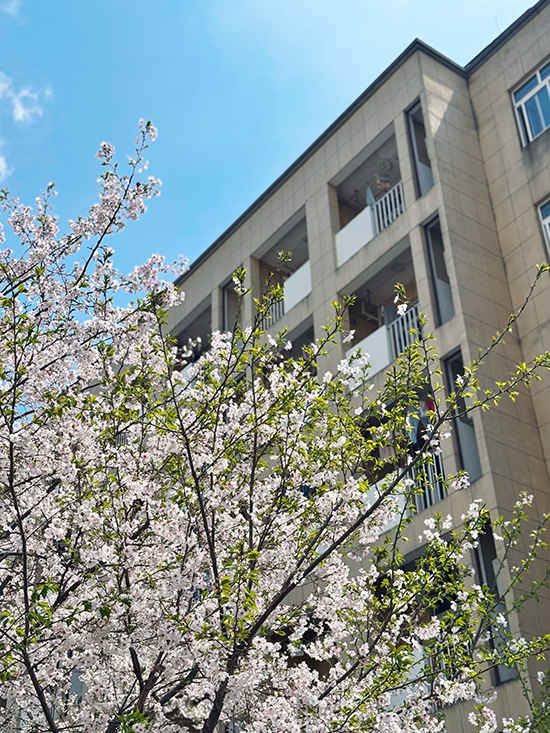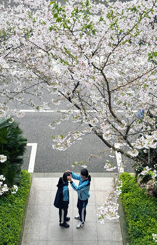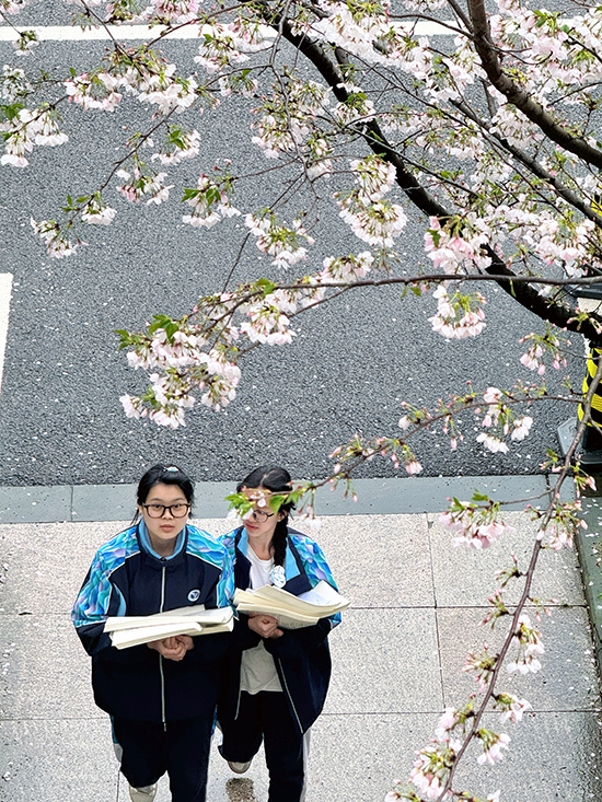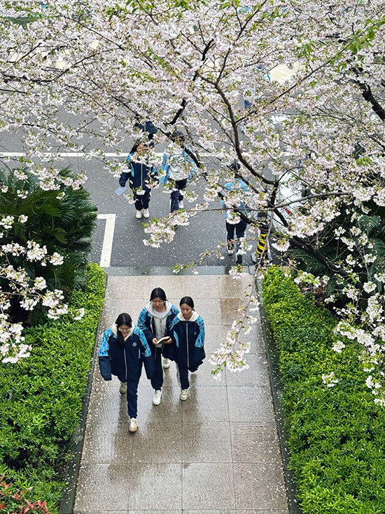 课间,师生纷纷驻足拍照,用镜头定格春日的美好。一条铺着灰色石板的小径贯穿花海,两侧绿灌木整齐列队,几位女生结伴而行,长发女孩低头专注书本,侧身女孩笑意盈盈与同伴低语,另一人轻松翻阅笔记,步伐轻快,仿佛将课堂的书香也带入了这自然的课堂。小径尽头,更多学生或三五成群合影留念,或独自坐在樱花树下静心阅读,任花瓣轻轻落在书页上。远处车辆缓行,与这静谧校园构成一幅动静相宜的春日画卷。
