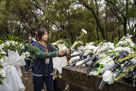 默哀仪式结束后,同学们依序步入纪念碑前,分批向英烈敬献鲜花。一束束洁白的菊花,承载着对革命先烈的深切追思与崇高敬意。同学们轻步上前,俯身献花,每一个动作都饱含虔诚。这不仅是一次献花仪式,更是一场跨越时空的对话——先烈们用生命守护的山河,今日由青年一代接续守望。