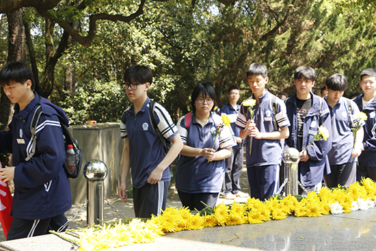 仪式尾声,同学们手持菊花,有序环绕纪念碑缓步瞻仰,并轻轻将鲜花献在碑前。一朵朵菊花,承载着无尽的追思,也象征着纯洁与坚定。这不仅是对先烈的告别,更是奔赴未来的誓言。