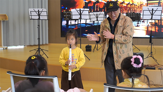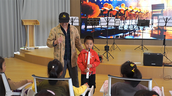 在金国梁老师的专业指导下,孩子们也拿起小巧的电吹管,从最简单的按键、气息控制学起。爷爷奶奶们在旁耐心陪伴、轻声鼓励,手把手辅助孩子们找准指法、感受节奏。稚嫩的气息与灵巧的手指相互配合,原本陌生的乐器渐渐发出断断续续却格外可爱的音符,现场充满欢声笑语。