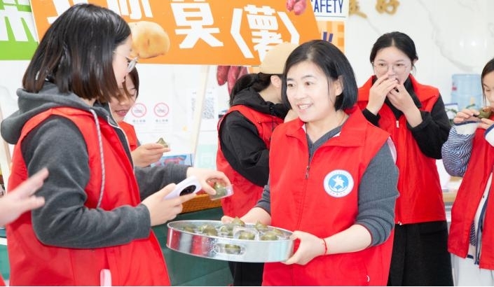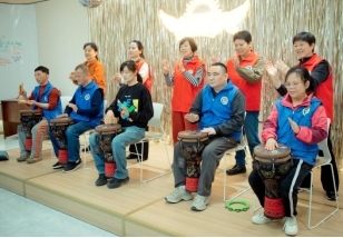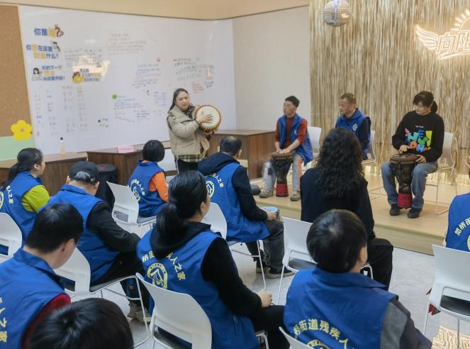 “听‘笕’星声”公益音乐会环节更是温情满满。向阳乐队奏响暖心旋律,工疗员们勇敢登台展示才艺。志愿者老师现场开展非洲鼓演奏指导,动人的鼓声既能愉悦心情,还能刺激手部血液循环,助力身心疗愈。这场专属特殊群体的才艺展示,不仅让他们收获掌声与肯定,更在舞台上绽放自信光芒,充分体现社会对残疾人的尊重、关爱与支持。活动最后,东港社区的东邻嫂与益笕蓝军嫂,将亲手制作的腌菜与新鲜青团送到现场的工疗员手中,为他们的春日餐桌添上了一份“妈妈的味道”。