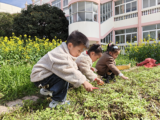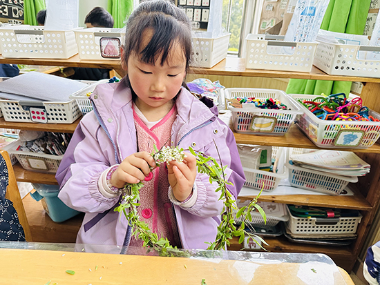 巧手编出春之意。中班幼儿在老师带领下采摘嫩绿柳条,回到教室后认真弯折、缠绕,将柔软枝条编成圆圆的花环。孩子们还别出心裁地搭配茶花、油菜花、桃花等春日小花,一只只独具特色的柳枝花环新鲜出炉。戴上亲手制作的花环,孩子们笑容灿烂,在实践中感受清明插柳的传统习俗,留住了春日的美好与温柔。