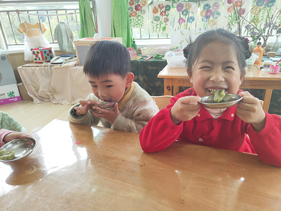 舌尖触碰清明味。小班幼儿与老师一同探寻清明美食,通过视频了解家乡传统点心。孩子们走进小农场采摘艾草,体验劳动的快乐。在老师指导下,大家分拣、煮烂、揉面,亲手制作清明果。揉一揉、包一包、压一压,一个个小巧可爱的青团渐渐成型,绿色外皮裹着香甜豆沙,藏着孩子们的认真与期待。蒸熟品尝,满口都是春日清香与节日温暖。