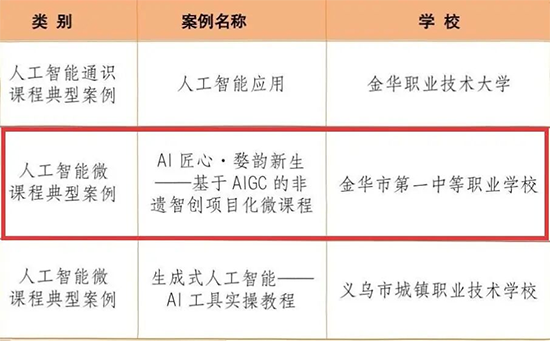 近日,教育部职业院校信息化教学指导委员会公布人工智能相关典型案例遴选结果,全市仅有三项学校成果入选,而其中金华市第一中等职业学校校长方婧牵头的《AI匠心・婺韵新生——基于AIGC的非遗智创项目化微课程》成功入选“人工智能微课程典型案例”。
