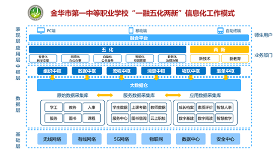 AI教学能够深度融入课堂、全方位赋能育人,离不开金一职多年来在数字基建上的厚积薄发。作为浙江省中职高水平学校、教育部第二批数字校园试点学校,该校从2014年起便以“智慧虹工程”为抓手,系统性推进数字校园建设,逐步形成了“建基座-聚应用-塑生态”的中职数智化转型路径,这一路径还被纳入《浙江省数字教育典型案例成果集(职业教育篇)》,成为全国中职院校的参考样本。