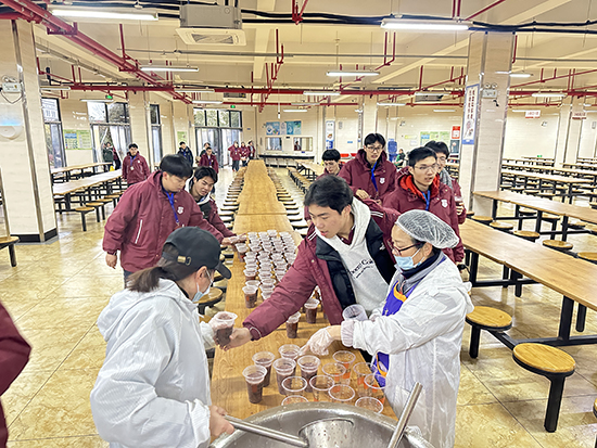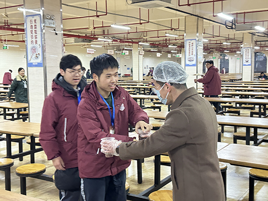 晚餐前,在学校食堂里,校党委书记刘忠明、校长夏峰巍、副书记陈建荣、副校长李柳芳等校领导早早来到现场,戴上口罩和手套,化身为“送粥人”。他们亲手为同学们盛上一碗碗热气腾腾的腊八粥,递到同学们手中,并送上“腊八安康”的节日祝福。软糯香甜的腊八粥在舌尖散开,温暖的不仅是胃,更是每一位职教中心学子的心。领到粥的同学们脸上都洋溢着幸福的笑容,捧着杯子细细品尝,暖意顺着喉咙一路蔓延至全身。“第一次在学校过腊八节,喝到了领导亲手递来的粥,感觉格外温暖!”“粥里有红豆、莲子、糯米,食材超丰富,甜到心里去了!”同学们你一言我一语,分享着这份冬日里的小确幸。