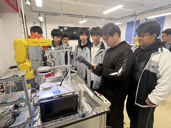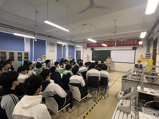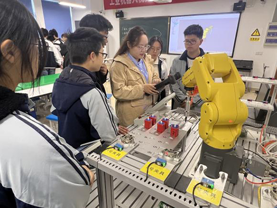 随后,师生们来到专业实训室进行参观学习。浙江工贸职业技术学院工业机器人技术专业作为温州市高职院校示范实训基地,拥有先进的工业机器人机械臂、智能工作站等实训设备。参观过程中,该院学生为柳市职校的同学们带来了一堂生动的工业机器人机械臂运动实操课。从机械臂的基础结构讲解,到精准的点位控制、轨迹运动演示,再到手把手指导编程与操作,每一个环节都让同学们目不暇接、兴致盎然。大家近距离感受智能制造技术的魅力,亲手体验机械臂的操控,直观了解专业核心技能与未来学习方向,进一步激发了对专业学习的热情与向往。