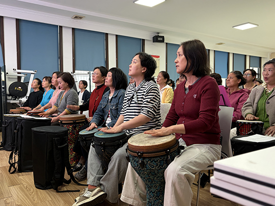 课堂上,近50名学员兴致高涨,跟着老师的节奏认真练习、反复磨合,手掌敲击鼓面的清脆声响此起彼伏,从零散生疏到整齐合拍,欢快的鼓点回荡在课堂内外。老师耐心纠错、悉心指导,学员们相互交流、共同进步,现场气氛轻松热烈、其乐融融。