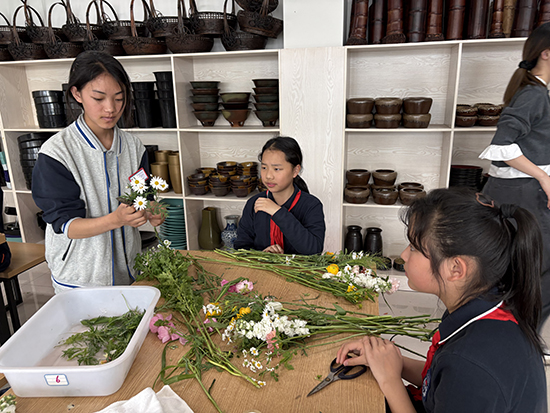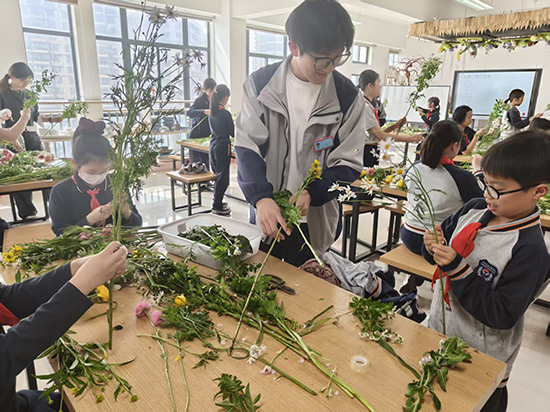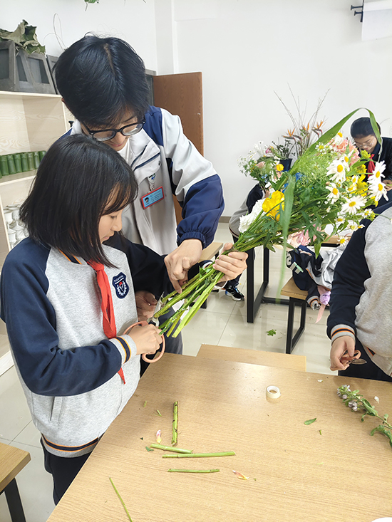 “老师,你看我做得好看吗?”“老师,你来自凉山,那里是什么样子的呀?”活动中,孩子们围着切吉加支叽叽喳喳地提问,她不仅耐心解答插花问题,还偶尔和孩子们分享自己家乡的故事,讲述自己来到北仑求学、学习技能的经历,让孩子们在体验花艺的同时,也感受到了山海相连的温暖与坚守。