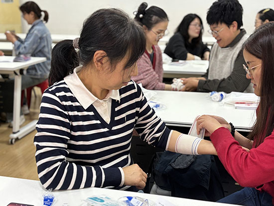 在开班第一课上,丁柏伟老师围绕气道异物梗阻急救与创伤救护中的止血、包扎技术展开教学。他通过“理论讲解+现场演示+实操练习”的方式,详细拆解了海姆立克急救法的操作要点,以及不同部位创伤的止血手法和包扎技巧。学员们认真听讲、积极互动,在模拟人身上反复练习,丁老师则逐一指导纠正,确保每位学员都能掌握规范动作。