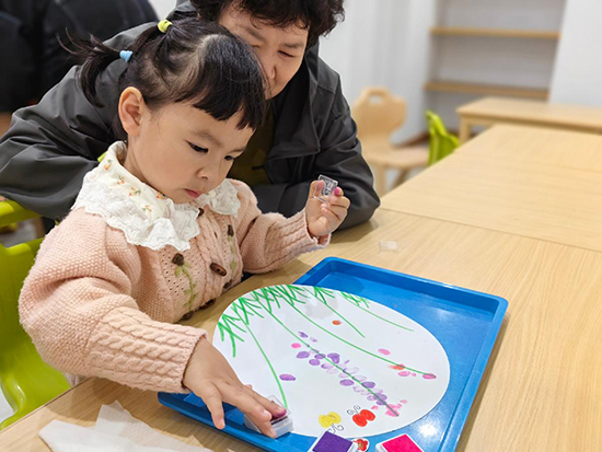 本次活动紧扣低龄幼儿成长规律,融合创意手工与集体游戏两大板块,将启蒙教育融入趣味互动。指尖创意环节,授课教师立足生活化启蒙理念,引导幼儿以手指为“画笔”,蘸取环保颜料在画纸上印拓花朵造型。孩子们沉浸于创作乐趣,用稚嫩小手勾勒专属创意作品,家长全程陪伴协助、记录美好瞬间,现场洋溢着亲子共育的温馨氛围,实现了趣味教学与亲情陪伴的深度融合。