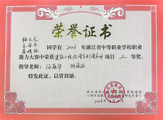 未来,学校将持续深耕职业教育,深化校企合作、拓展校校联动,强化技术技能人才培养,助力更多学子精进技能、绽放风采。(嘉兴市建筑工业学校工程造价组、黄方瑞)